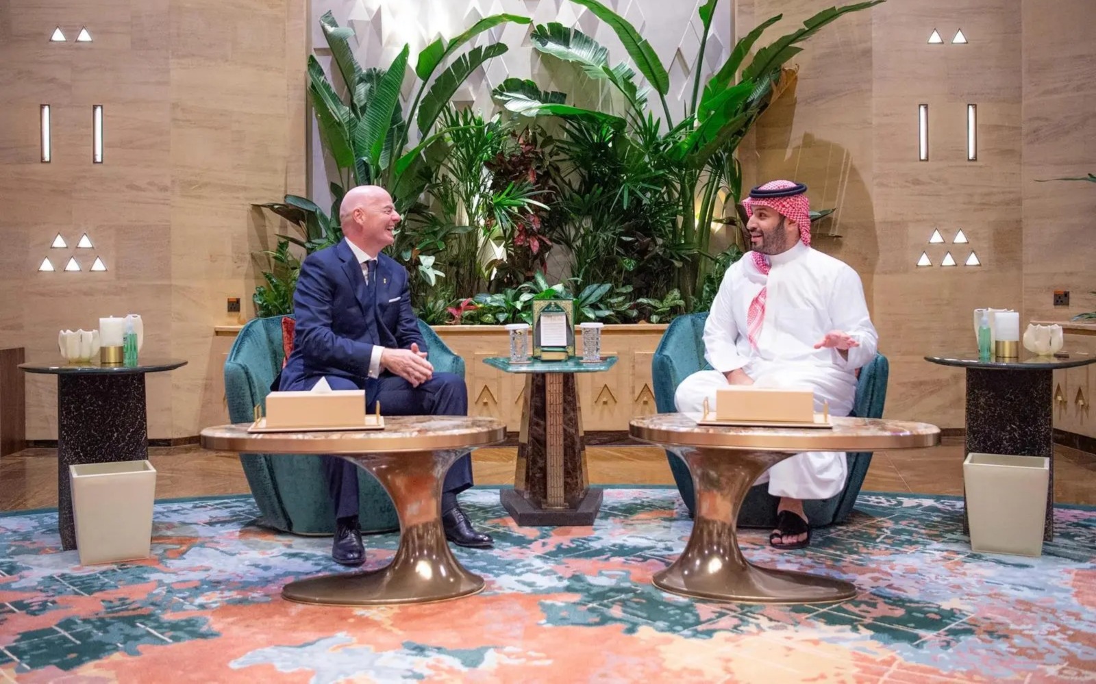 التقى ولي العهد، رئيس مجلس الوزراء السعودي، صاب السمو الملكي الأمير محمد بن سلمان بن عبدالعزيز آل سعود، في قصر اليمامة في الرياض، رئيس الاتحاد الدولي لكرة القدم (فيفا)، جياني إنفانتينو.