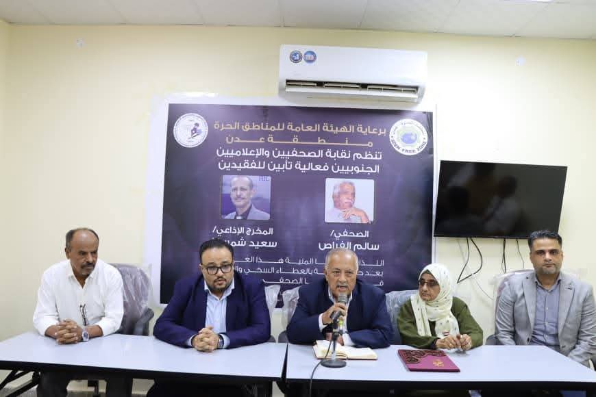 وتحدث باحشوان في كلمته عن الأدوار البارزة للقامتين الإعلامية الفقيدين الصحفي سالم الفراص والمخرج سعيد شمسان، وحضورهما المتميز في عالم الصحافة والإعلام خلال مسيرتهما المهنية الطويلة، لافتاً إلى أن هذا الحفل التأبيني يأتي في إطار جهود النقابة لتكريس ثقافة الوفاء والعرفان بجهود الرواد الأوائل من الصحفيين والإعلاميين الجنوبيين في بناء مسيرة إعلامية جنوبية راسخة، حملت هموم الناس ونقلت تطلعاتهم بأمانة ومسؤولية، وما قدموه من إسهامات عظيمة عبر سنوات طويلة في خدمة الإعلام الجنوبي وقضايا المجتمع، وكانوا جزءاً أصيلاً من معركة الوعي الجنوبي وتطلعاته نحو الحرية والكرامة.