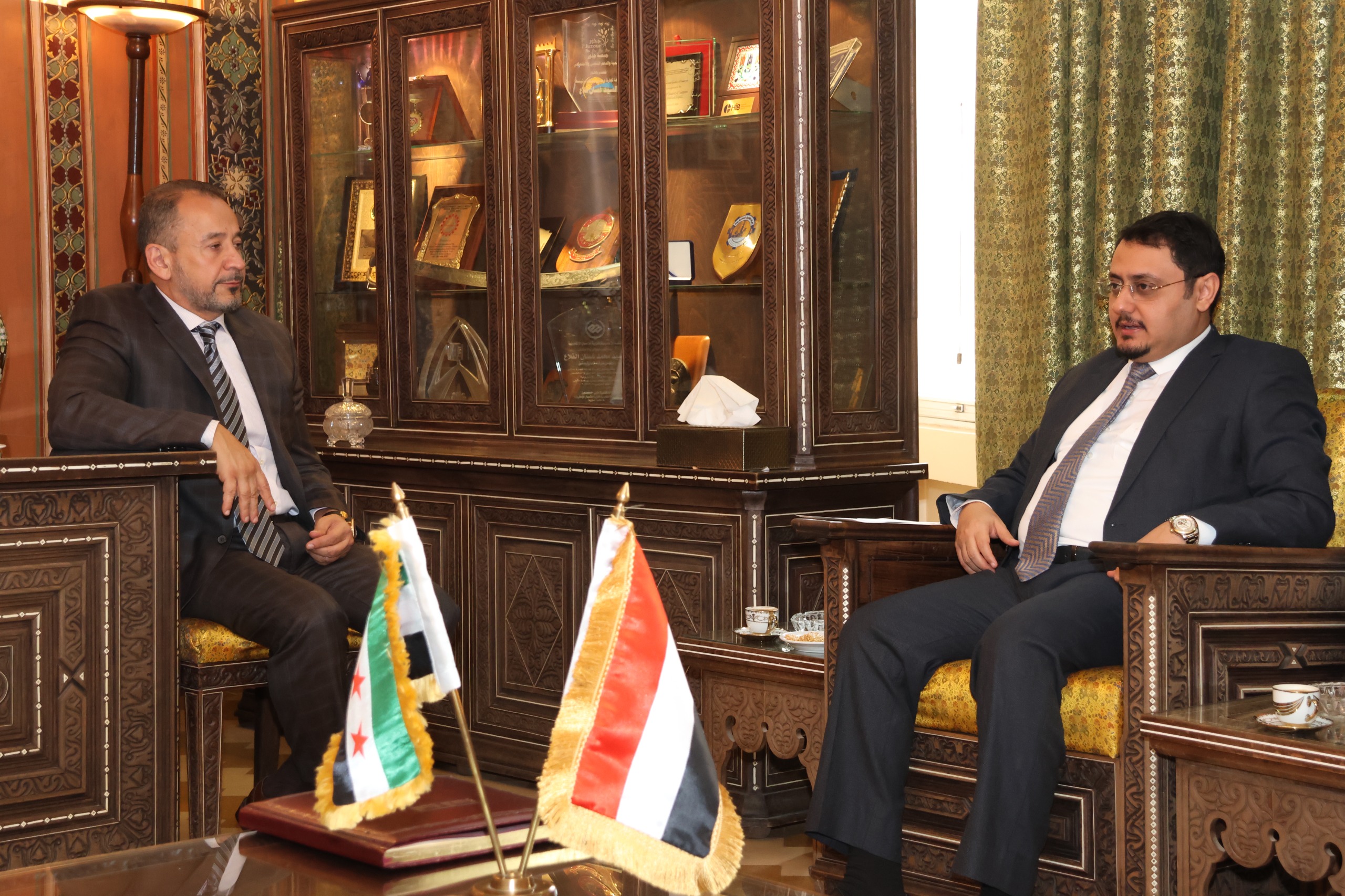 بحث القائم بأعمال السفارة اليمنية في دمشق، محمد بعكر، اليوم، رئيس غرفة تجارة دمشق، المهندس عصام زهير الغريواتي، سبل تعزيز العلاقات الاقتصادية والتجارية بين البلدين الشقيقين، وآليات تطوير التعاون المشترك.