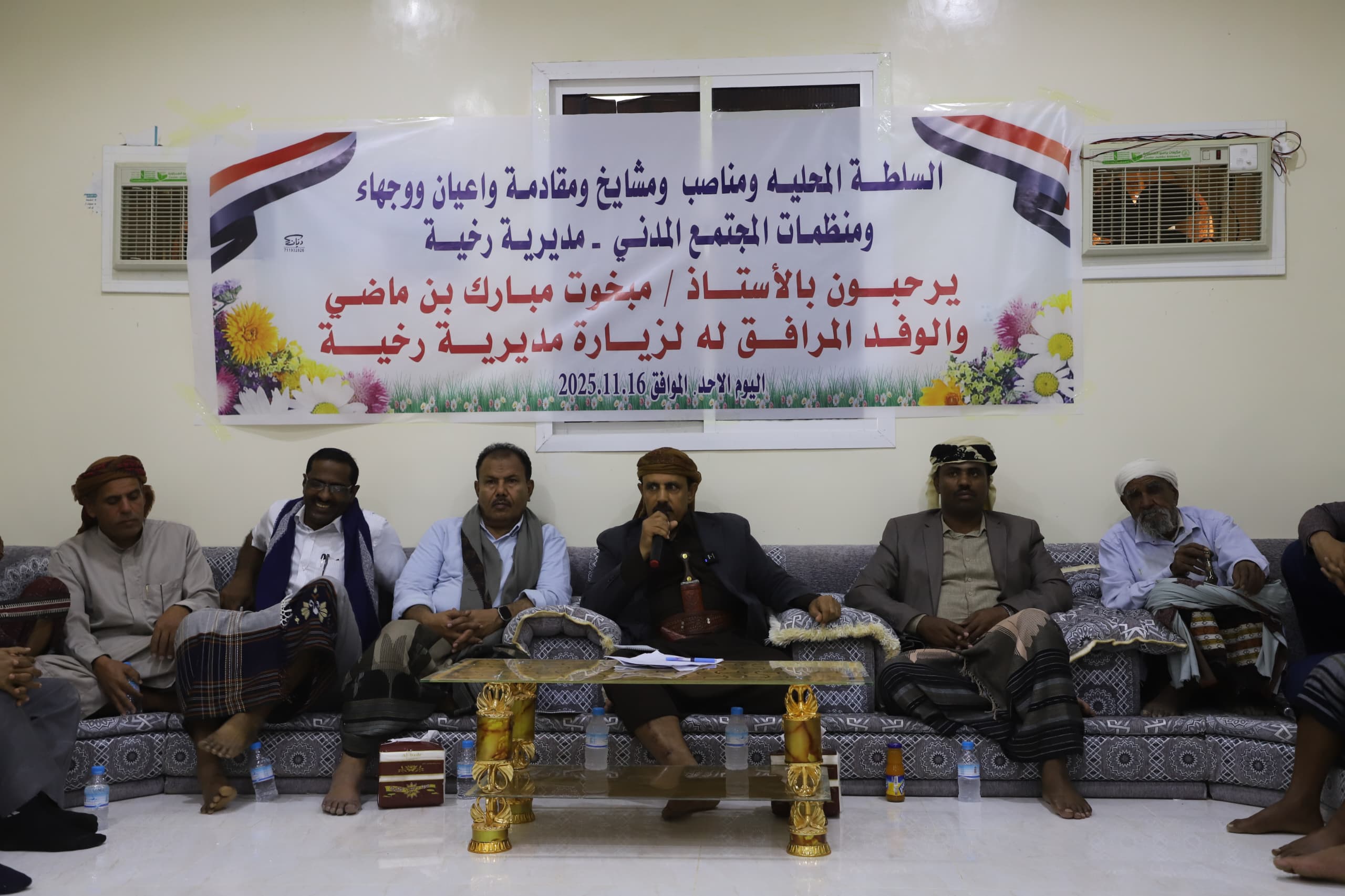 والتقى المحافظ، ومعه وكيل المحافظة لشؤون الوادي والصحراء، بقيادة السلطة المحلية والمكتب التنفيذي ومناصب ومشائخ ومقاومة وأعيان ووجهاء مديرية رخية ومنسوبي منظمات المجتمع المدني.