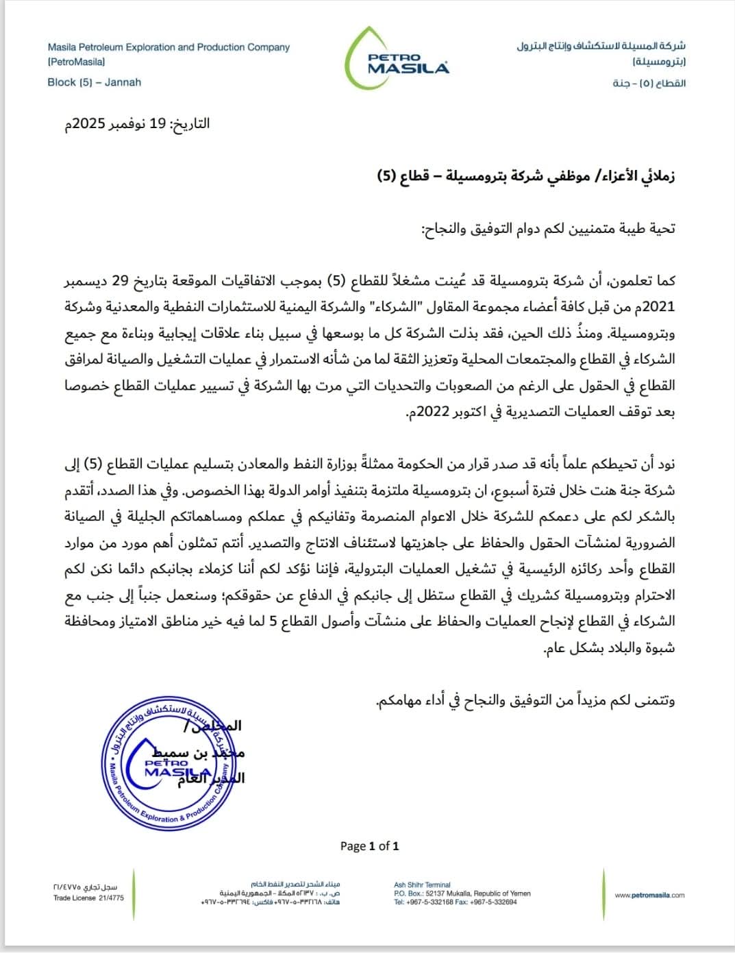 أكدت مذكرة “بترومسيلة” أن القرار صدر عن الحكومة اليمنية ممثلة بوزارة النفط والمعادن، مشيرة إلى التزامها بتنفيذ أوامر الدولة بهذا الخصوص.