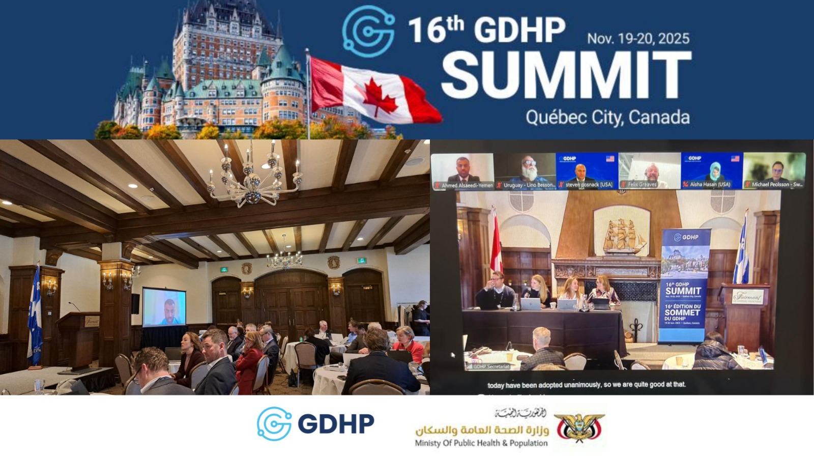 شاركت الجمهورية اليمنية، اليوم، عبر تقنية الاتصال المرئي، في أعمال القمة السادسة عشرة للشراكة العالمية للصحة الرقمية (GDHP)، المنعقدة في مدينة كيبيك الكندية بمشاركة وفود من أكثر من 40 دولة حول العالم.