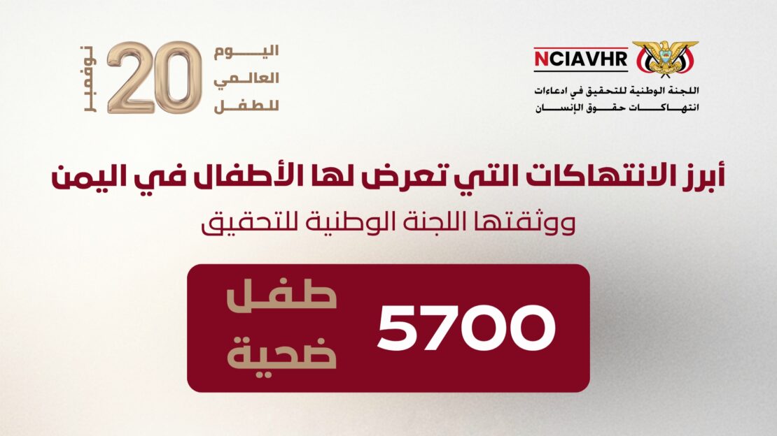 أعلنت اللجنة الوطنية للتحقيق في ادعاءات انتهاكات حقوق الإنسان، بالتزامن مع اليوم العالمي للطفل، إحصائيات حول الانتهاكات الجسيمة التي طالت الأطفال ووثقتها اللجنة في مختلف المحافظات، والتي بلغ إجمالي ضحاياها 5,700 طفل.