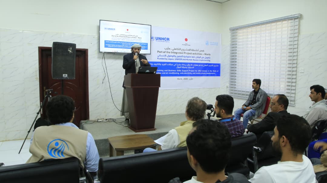 تسلم 45 متدرباً ومتدربة من مخيمات النزوح بمحافظة مأرب، حقائب المهنة في 3 مجالات مهنية تدربوا عليها، ضمن أنشطة المشروع التكاملي، التي نفذتها المفوضية السامية للاجئين ومؤسسة الوصول الانساني بتمويل ياباني.