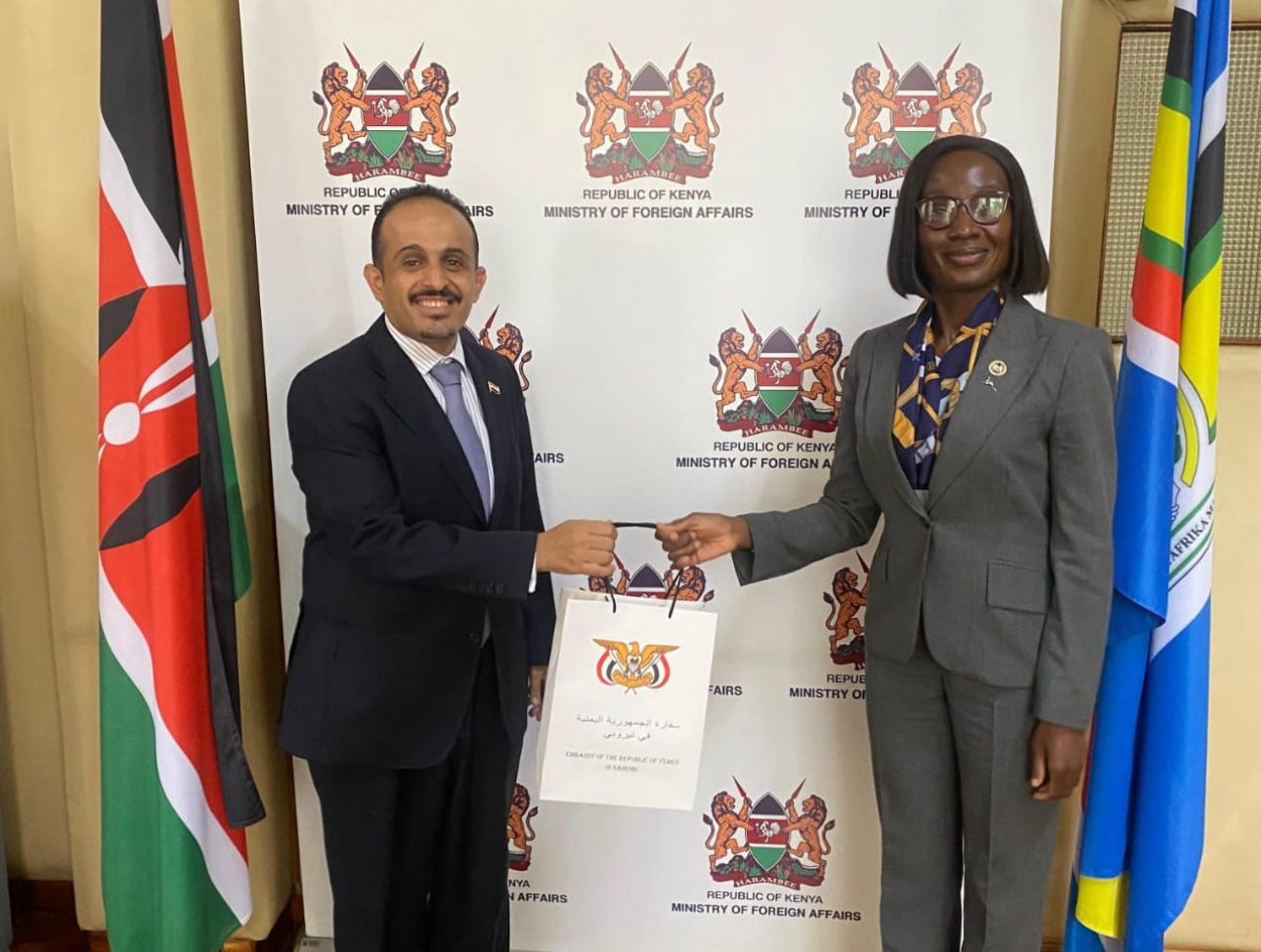 بحث القائم بأعمال السفارة اليمنية في نيروبي، عبدالسلام العواضي، اليوم، مع مديرة دائرة البروتوكول بوزارة الخارجية وشؤون المغتربين الكينية، سيفيرين لويال، سبل تعزيز العلاقات الثنائية بين البلدين.