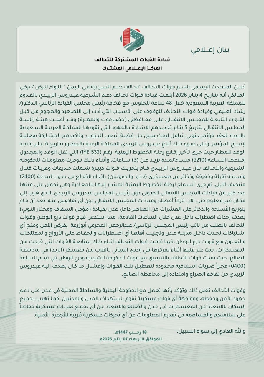 أعلن المتحدث الرسمي باسم قوات التحالف “تحالف دعم الشرعية في اليمن ” اللواء الركن/ تركي المالكي أنه بتاريخ 4 يناير 2026 أبلغت قيادة قوات تحالف دعم الشرعية عيدروس الزبيدي بالقدوم للمملكة العربية السعودية خلال 48 ساعة للجلوس مع فخامة رئيس مجلس القيادة الرئاسي الدكتور/ رشاد العليمي وقيادة قوات التحالف للوقوف على الأسباب التي أدت إلى التصعيد والهجوم من قبل القوات التابعة للمجلس الانتقالي على محافظتي (حضرموت والمهرة).
