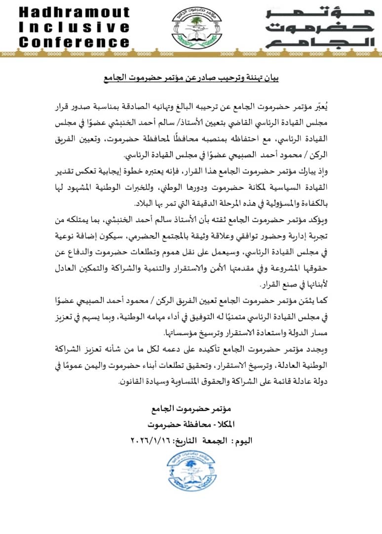 كما ثمّن مؤتمر حضرموت الجامع تعيين الفريق الركن محمود أحمد الصبيحي عضوًا في مجلس القيادة الرئاسي، متمنيًا له التوفيق في أداء مهامه الوطنية، بما يسهم في تعزيز مسار الدولة، واستعادة الاستقرار، وترسيخ مؤسساتها.