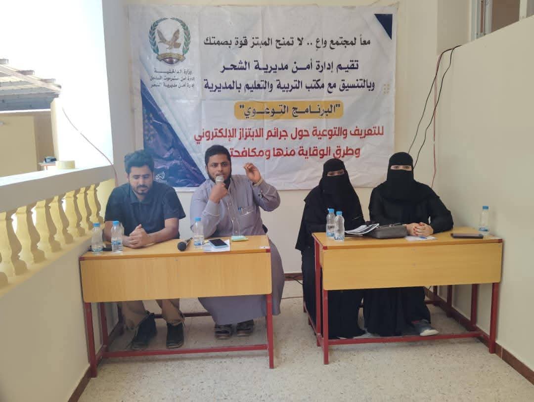 ضمن برنامجها التوعوي حول ظاهرة الابتزاز الإلكتروني، نفذت وحدة مكافحة الابتزاز الإلكتروني بأمن مديرية الشحر، وبالتنسيق مع مكتب التربية والتعليم، صباح اليوم الأربعاء، نزولاً توعوياً إلى ثانوية الراشد للبنات بمدينة الحامي، استهدف طالبات الثانوية بمحاضرة توعوية حول مفهوم الابتزاز الإلكتروني وطرق الوقاية منه.