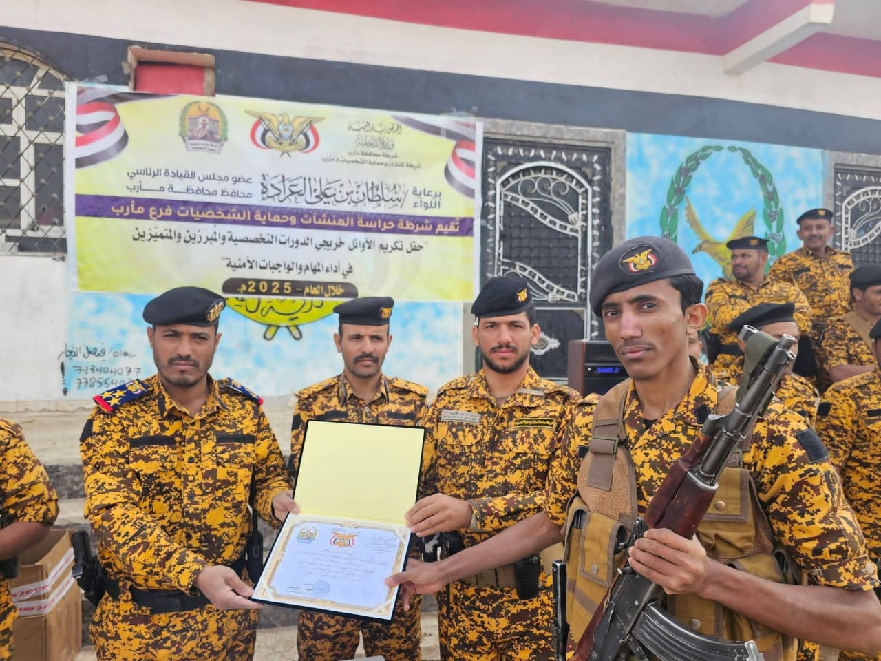 أقامت شرطة حراسة المنشآت وحماية الشخصيات فرع مأرب، اليوم، حفلًا لتكريم الأوائل من خريجي الدورات التخصصية والمبرزين في أداء المهام والواجبات الأمنية خلال العام 2025.