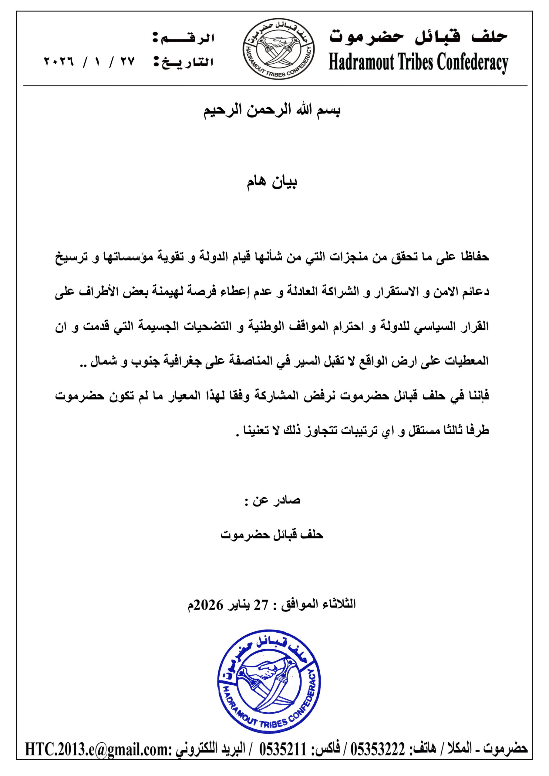 وأشار البيان إلى أن حلف قبائل حضرموت يرفض أي مشاركة أو ترتيبات لا تكون فيها حضرموت طرفًا مستقلًا وفقًا لهذا المعيار، مؤكدًا أن أي ترتيبات تتجاوز ذلك لا تمثل الحلف ولا تلزمه.