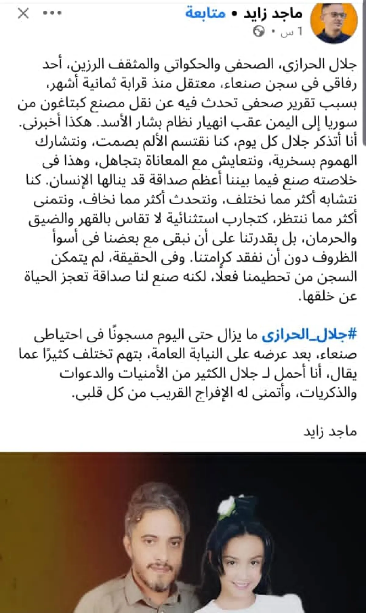 وأشار زائد إلى أنه قضى فترة اعتقال مشتركة مع الحرازي في سجن صنعاء، واصفاً إياه بأنه صحفي مثقف وهادئ الطبع، مؤكداً أن الظروف القاسية التي مر بها المعتقلون ساهمت في توطيد علاقتهما خلال فترة الاعتقال.