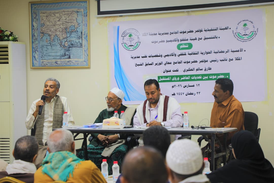 جاء ذلك خلال الأمسية الرمضانية الحوارية التي نظمتها ، الهيئة التنفيذية لمؤتمر حضرموت الجامع بمديرية مدينة المكلا، بالتنسيق مع هيئة “مثقفو وأكاديميو حضرموت”، بحضور جمع من الأكاديميين والباحثين والشخصيات والنخب الاجتماعية.