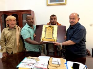 وجرى تسليم الدرع التكريمي خلال لقاء عقده عضو مجلس القيادة المحافظ الخنبشي بأعيان ومشايخ المديرية، بحضور وكيل المحافظة الأستاذ حسن سالم الجيلاني، حيث جرى مناقشة أوضاع المديرية وأبرز القضايا الخدمية والتنموية التي تهم المواطنين.
