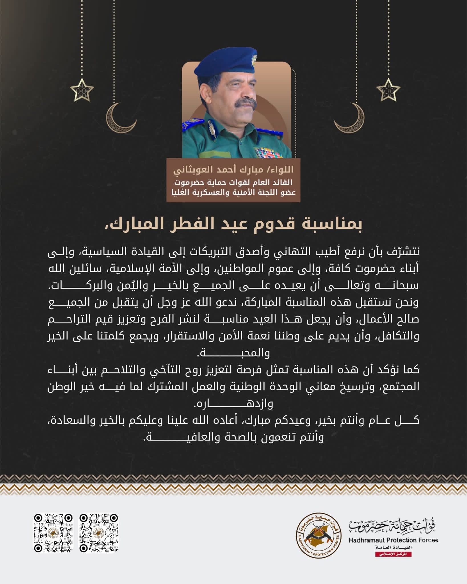 بعث اللواء مبارك أحمد العوبثاني، القائد العام لقوات حماية حضرموت وعضو اللجنة الأمنية والعسكرية العليا، برقية تهنئة بمناسبة حلول عيد الفطر المبارك، رفع من خلالها أطيب التهاني وأصدق التبريكات إلى القيادة السياسية، وإلى أبناء حضرموت كافة، وعموم المواطنين، والأمة الإسلامية.