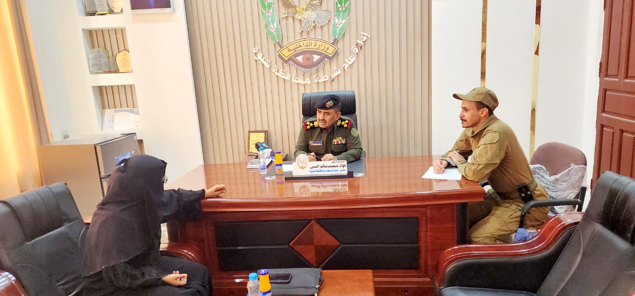 التقى مدير عام شرطة محافظة شبوة، العميد الركن فؤاد محمد النسي، صباح اليوم، رئيسة اللجنة الوطنية للمرأة بالمحافظة، هيام طالب القرموشي، في لقاء خصص لمناقشة سبل تعزيز دور الشرطة النسائية.