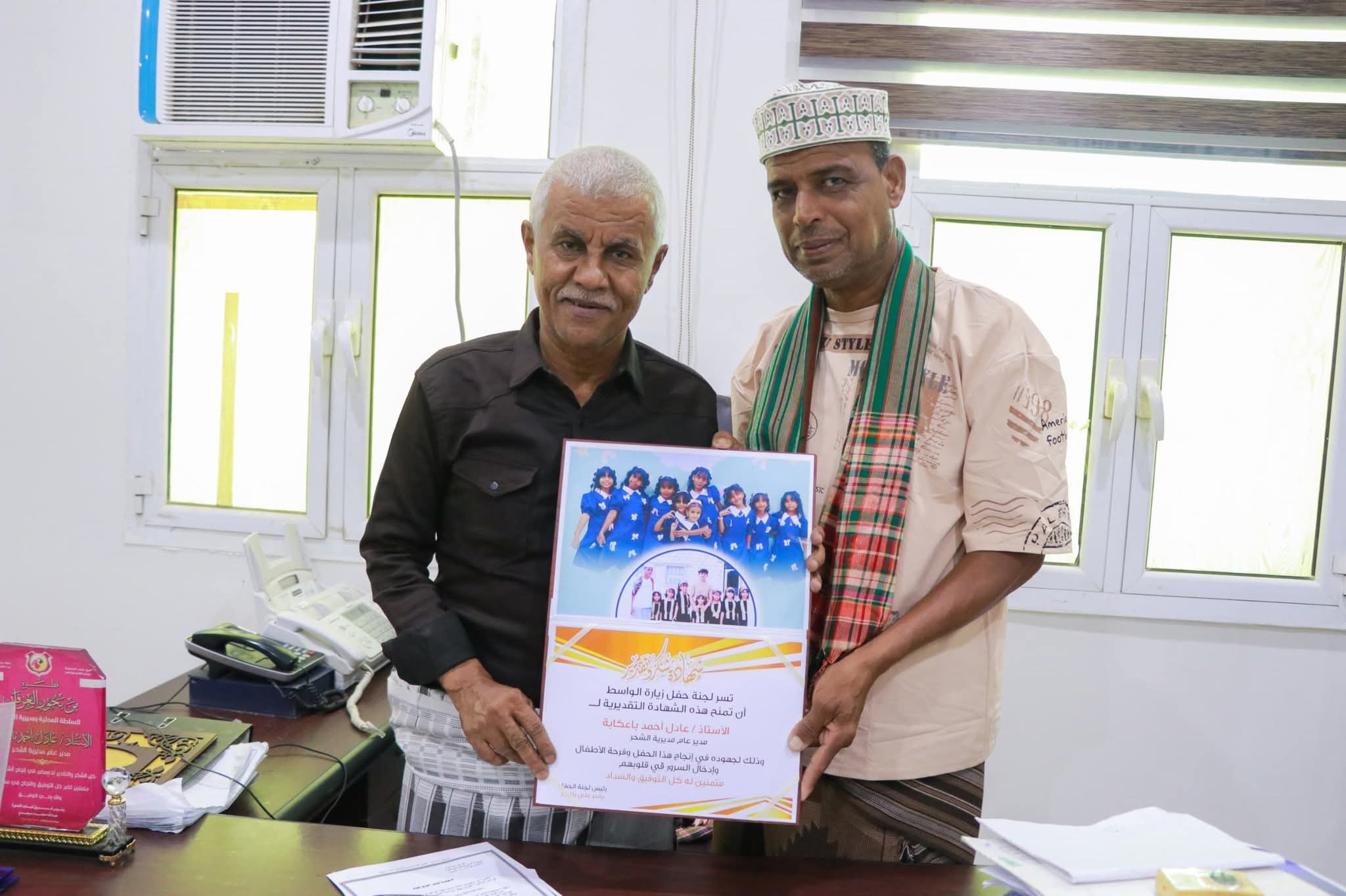 تسلم المدير العام لمديرية الشحر الأستاذ عادل أحمد باعكابة بمكتبه شهادة تقديرية من قبل لجنة حفل زيارة الست السنوية زيارة الواسط الأخ ياسر علي باجبير ، وذلك تقديرًا لجهوده ودعمه المستمر لإنجاح الفعاليات المجتمعية، وفي مقدمتها الأنشطة الثقافية والترفيهية الخاصة بالأطفال.