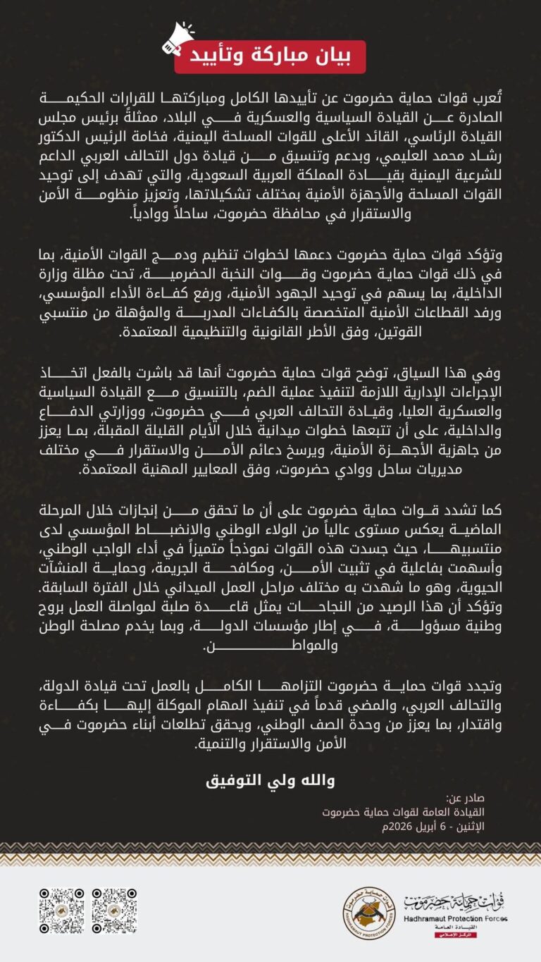 أعربت قوات حماية حضرموت عن تأييدها الكامل ومباركتها للقرارات الصادرة عن القيادة السياسية والعسكرية في البلاد، ممثلةً برئيس مجلس القيادة الرئاسي القائد الأعلى للقوات المسلحة الدكتور رشاد محمد العليمي، وبدعم من قيادة التحالف العربي بقيادة المملكة العربية السعودية، والتي تستهدف توحيد القوات المسلحة والأجهزة الأمنية وتعزيز الأمن والاستقرار في محافظة حضرموت.