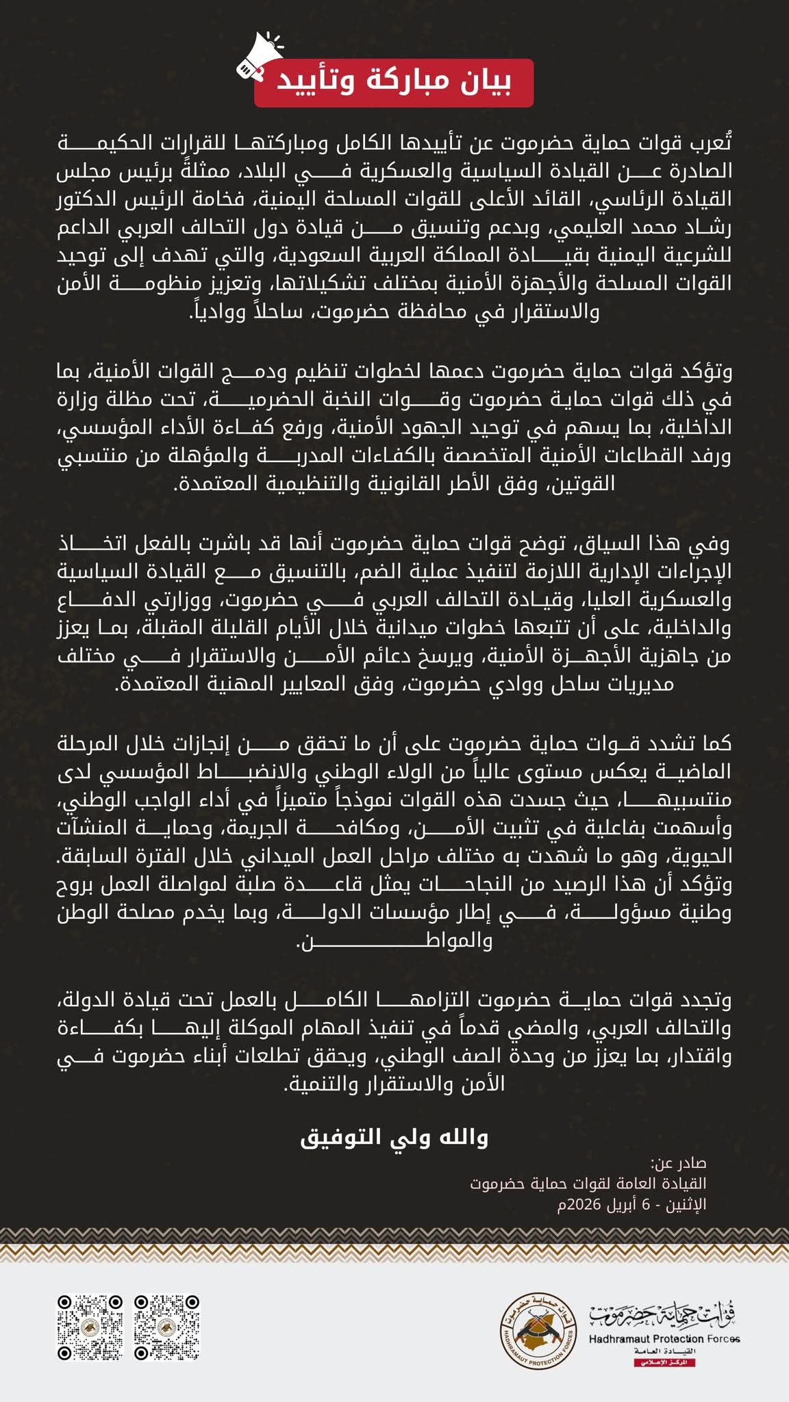تُعرب قوات حماية حضرموت عن تأييدها الكامل ومباركتها للقرارات الحكيمة الصادرة عن القيادة السياسية والعسكرية في البلاد، ممثلةً برئيس مجلس القيادة الرئاسي، القائد الأعلى للقوات المسلحة اليمنية، فخامة الرئيس الدكتور رشاد محمد العليمي، وبدعم وتنسيق من قيادة دول التحالف العربي الداعم للشرعية اليمنية بقيادة المملكة العربية السعودية، والتي تهدف إلى توحيد القوات المسلحة والأجهزة الأمنية بمختلف تشكيلاتها، وتعزيز منظومة الأمن والاستقرار في محافظة حضرموت، ساحلاً ووادياً.