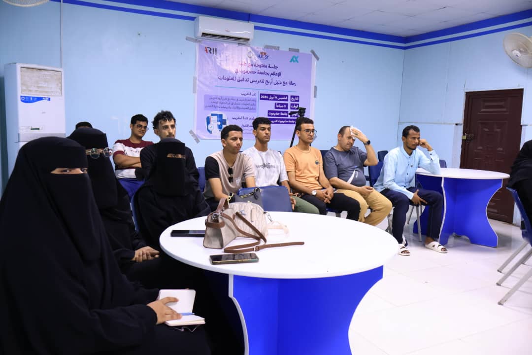 نظمت إدارة الإعلام بجامعة حضرموت اليوم، جلسة مفتوحة لطلاب قسم الإعلام وخريجيه، عن “دليل أريج لتدريس تدقيق المعلومات”، قدمها عضو الشبكة العربية لمدققي المعلومات الأخ أحمد الأشول.