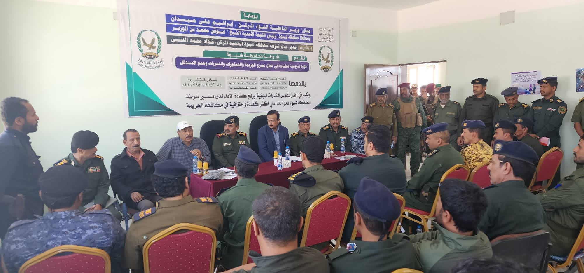 من جانبه، أوضح مدير عام شرطة محافظة شبوة، العميد الركن فؤاد محمد النسي، أن هذه الدورة تأتي ضمن خطة تدريبية شاملة تهدف إلى بناء قدرات رجال الأمن وفق أسس علمية حديثة. وأكد أن البرنامج التدريبي يشرف عليه نخبة من المختصين والخبراء الأمنيين الذين سيقدمون محاضرات نظرية وتطبيقات عملية متقدمة. وقد نقل تحيات معالي وزير الداخلية، اللواء الركن إبراهيم علي حيدان.
