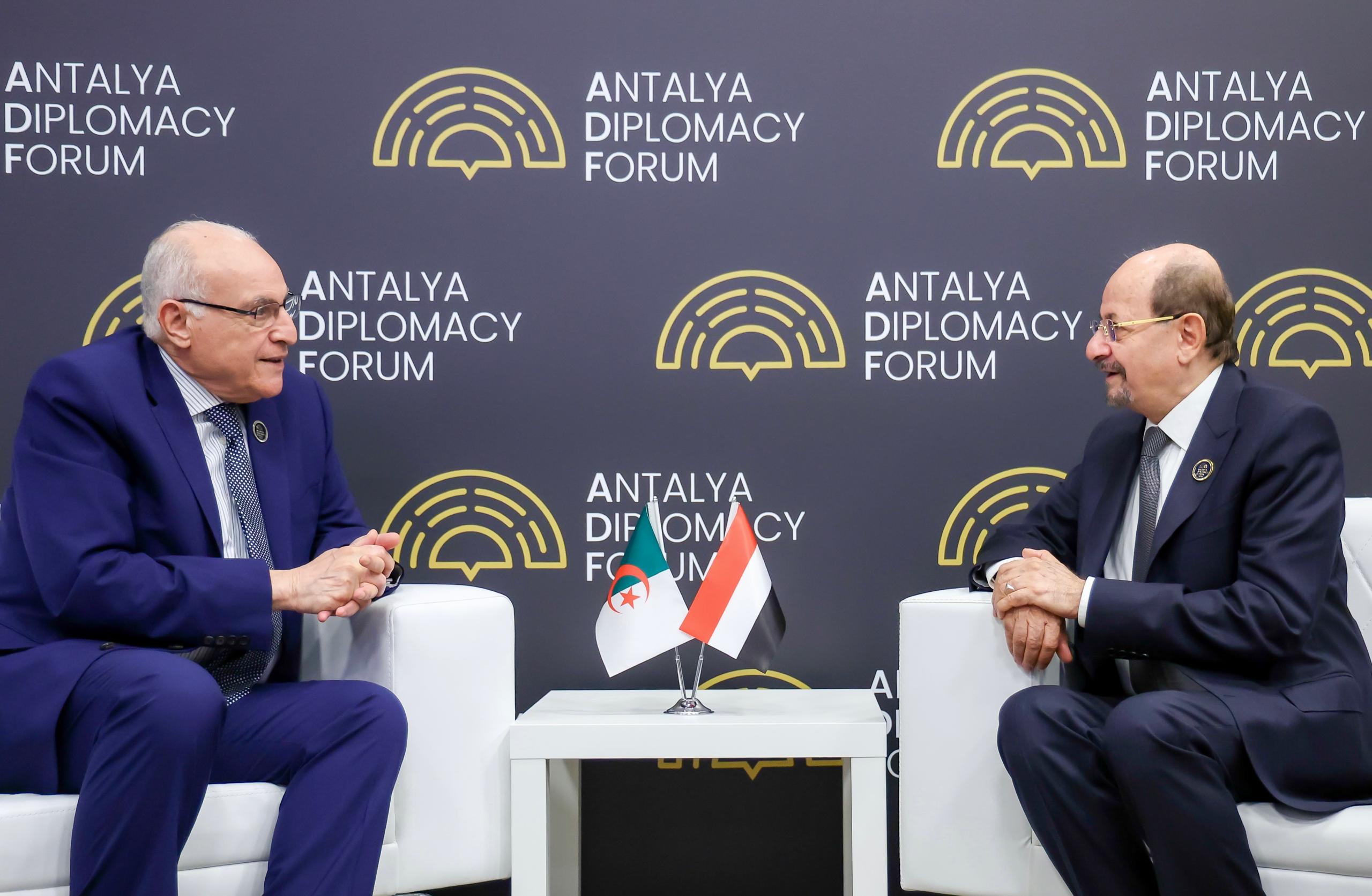 التقى دولة رئيس مجلس الوزراء وزير الخارجية وشؤون المغتربين، الدكتور شائع محسن الزنداني، اليوم، على هامش الدورة الخامسة لمنتدى أنطاليا الدبلوماسي، وزير الشؤون الخارجية والجالية الوطنية بالخارج بالجمهورية الجزائرية الديمقراطية الشعبية، أحمد عطاف.