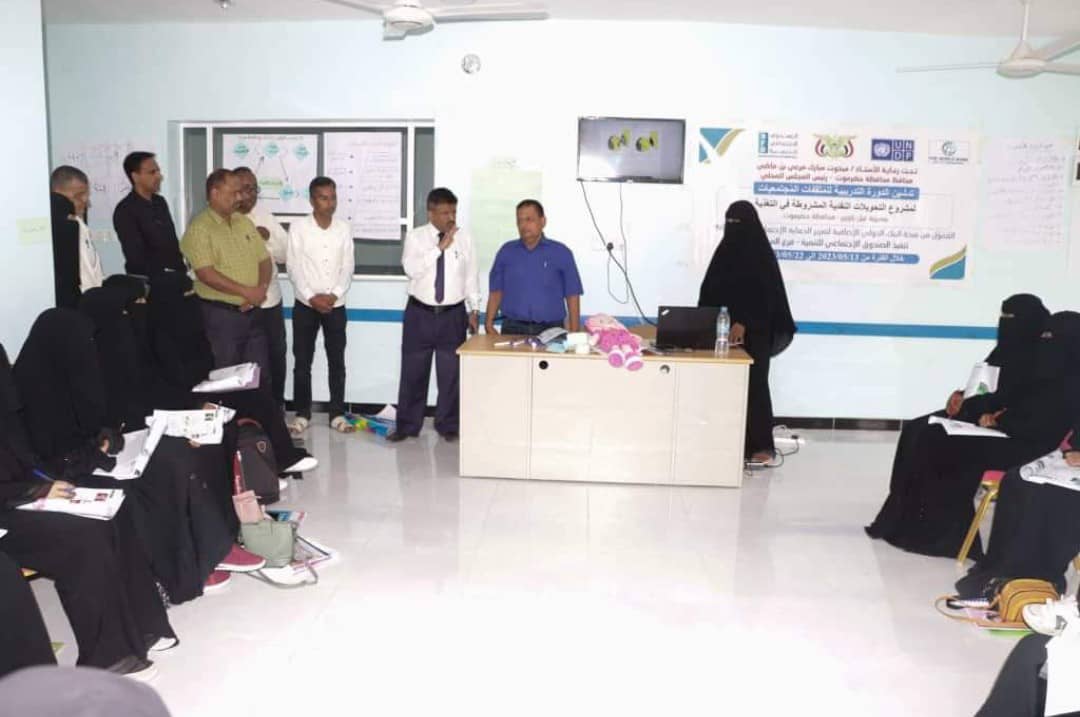 دشن كل من الدكتور محمد صالح الجمحي المدير العام لمكتب وزارة الصحة العامة والسكان بحضرموت الساحل ، و الدكتور عوض لقصم المدير العام للصندوق الاجتماعي للتنمية فرع المكلا ، و الأستاذ سالم العطيشي المدير العام لمديرية غيل باوزير ، و الدكتور فائز بازار مدير مكتب الصحة والسكان بالمديرية الدورة التدريبية للمثقفات المجتمعيات ضمن مشروع التحويلات النقدية المشروطة في التغذية بمديرية غيل باوزير ، وذلك بتمويل من البنك الدولي تستمر على مدى عشرة أيام تستهدف تدريب 140 مشاركة من المثقفات المجتمعيات في جميع مناطق المديرية .