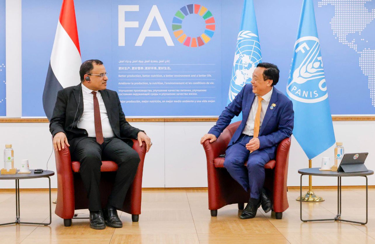 من جانبه، اكد المدير العام لمنظمة الأمم المتحدة للأغذية والزراعة (الفاو)، أن معالجة وضع الأمن الغذائي في اليمن يأتي في اولويات المنظمة، وأن الفاو على تواصل مستمر مع شركاء اليمن الدوليين وفي مقدمتهم الصناديق والمؤسسات المالية الدولية من اجل تمويل مشاريعه في اليمن في مجال التنمية المستدامة، وتمويل مشاريع مشتركة تتعلق بالصندوق الأخضر للمناخ، ودعا اليمن للانضمام إلى برنامج الشراكة العالمية بشأن الأمراض الحيوانية العابرة للحدود (GPP-TAD).