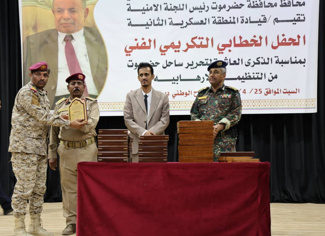 برعاية كريمة من عضو مجلس القيادة الرئاسي، محافظ حضرموت، الأستاذ سالم أحمد الخنبشي، نظّمت المنطقة العسكرية الثانية، مساء اليوم بمدينة المكلا، حفلاً خطابياً وفنياً تكريمياً، احتفاءً بالذكرى العاشرة لتحرير ساحل حضرموت من سيطرة تنظيم القاعدة الإرهابي، في يوم ٢٤ إبريل من العام ٢٠١٦م، وذلك بحضور وكيل محافظة حضرموت الأستاذ حسن سالم الجيلاني، وقائد المنطقة العسكرية الثانية اللواء محمد عمر اليميني، إلى جانب عدد من القيادات العسكرية والأمنية والشخصيات الحكومية والمجتمعية.