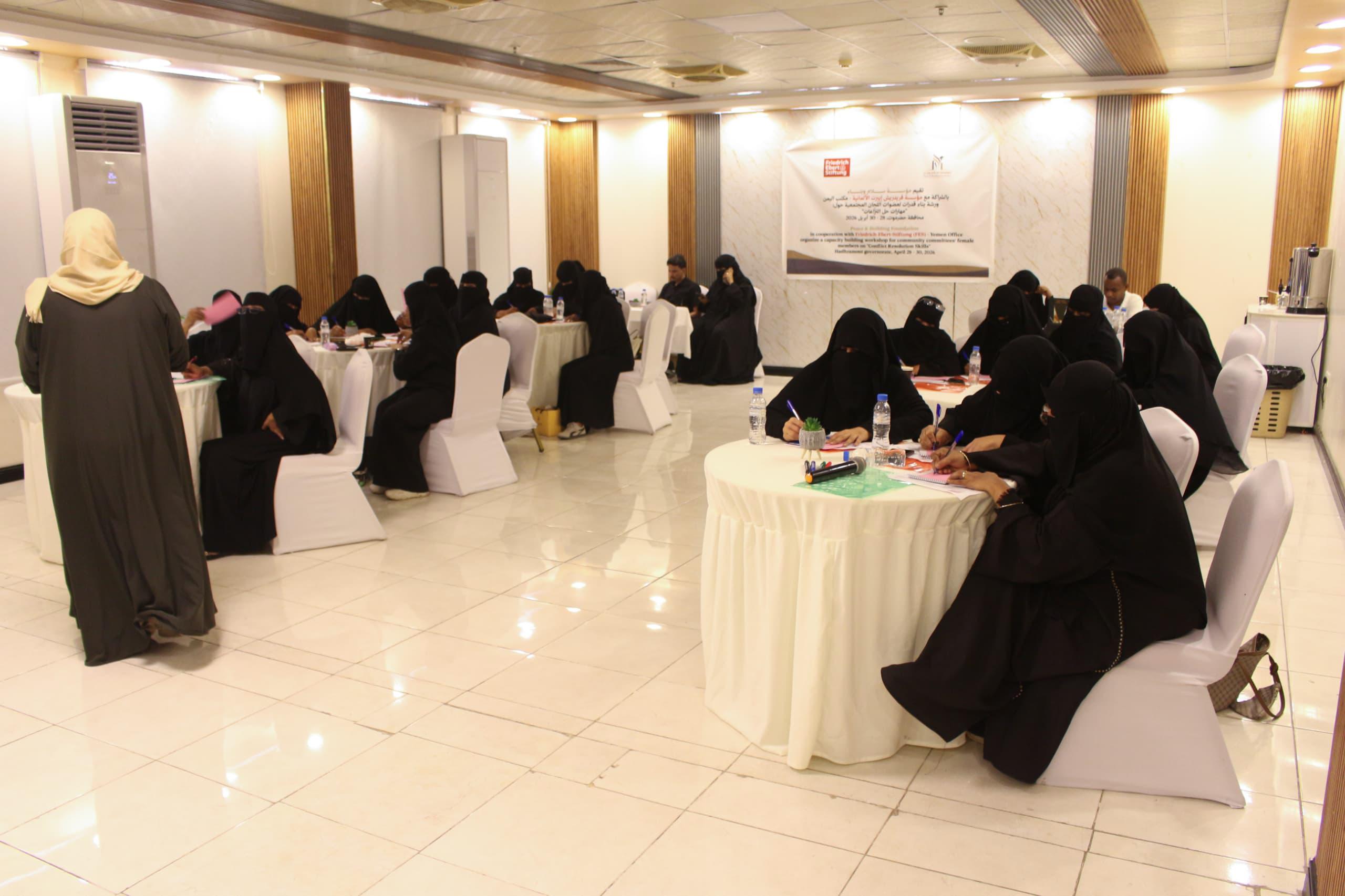 دشن المدير العام لمديرية مدينة المكلا الأستاذ فياض باعامر، صباح اليوم بالمكلا، ورشة بناء قدرات عضوات اللجان المجتمعية حول مهارات حل النزاعات، التي تنظمها مؤسسة سلام وبناء بالشراكة مع مؤسسة فريدريش إيبرت الألمانية – مكتب اليمن، وبمشاركة عدد من عضوات اللجان المجتمعية في المديرية.