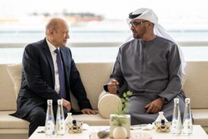 ورحب صاحب السمو رئيس دولة الامارات العربية المتحدة خلال اللقاء الذي جرى في مجلس قصر البحر، برئيس مجلس القيادة الرئاسي، وهنأه بمناسبة اليوم الوطني للجمهورية اليمنية الثاني والعشرين من مايو، متمنياً لليمن وشعبه الخير والنماء.