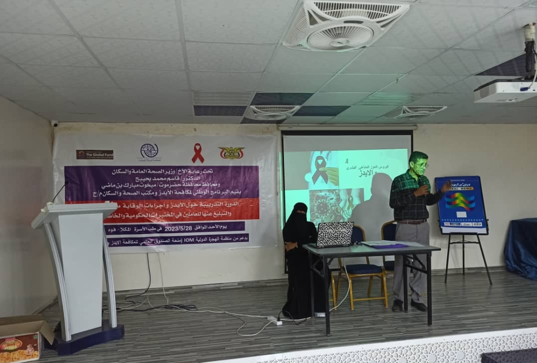 من جانبه أستعرض الأستاذ أحمد علي البيتي المدير العام للبرنامج الوطني لمكافحة الأيدز بحضرموت الساحل بعض المعلومات الاساسية حول فيروس نقص المناعة البشري ، و الوضع الوبائي على المستوى المحلي والعالمي والاقليمي ، مشيرا إلى أن الدورة تهدف إلى تزويد المشاركين بالمعلومات الجديدة والحديثة في مجال الايدز و الكوفيد 19 و التشخيص والوقاية من العلاج ، و كيفية تعريف المشاركين بأهمية الاكتشاف المبكر للحالات ونظام الإحالة ، اضافة إلى تطبيق معايير السلامة في التعامل مع الدم ، وكذلك استخدام العلاج الوقائي بعد التعرض المهني للإصابة بفيروس العوز المناعي البشري ، داعيا المشاركون إلى ضرورة اكتساب الخبرات والمعلومات الجديدة التي تمكنهم من كيفية التعامل مع الحالات واجراءات الوقاية من الإصابة شاكرا كل من أسهم في تنظيم هذه الدورة ومنظمة الهجرة الدولية لدعمها للدورة .