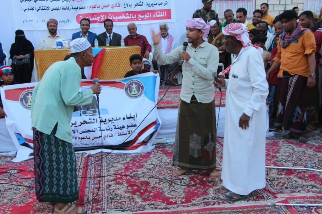 تخلل الحفل عدد من الفقرات الفنية والالعاب الشعبية لفرقتي ( سالم و علي سعيد و الخلافة ) للالعاب الشعبية كما شارك حي عقل باعوين بلعبة العدة ، و شاركت زهرات فرقة الاضواء بفقرة ترحيبية كما شارك النجمين عبدالله بلقرع “زبيو” و عبدالله الحوري و الشاب محمد عمر باظفاري استكش النور بعد الظلام من اعداد الاخ حسين حنين رئيس دائرة الفكر و الارشاد للإدارة المحلية للمجلس الانتقالي الجنوبي بمديرية الشحر ، وشارك الشاعران محمد علي عبدالقوي و حسن عمر العمري بقصائد شعرية ترحيبية و احتفالا بزيارة فادي باعوم و الوفد المرافق له و مباركة لنجاح الحوار الجنوبي و توقيع الميثاق الوطني الجنوبي و نجاح الدورة السادسة للجمعية الوطنية للمجلس الانتقالي الجنوبي.