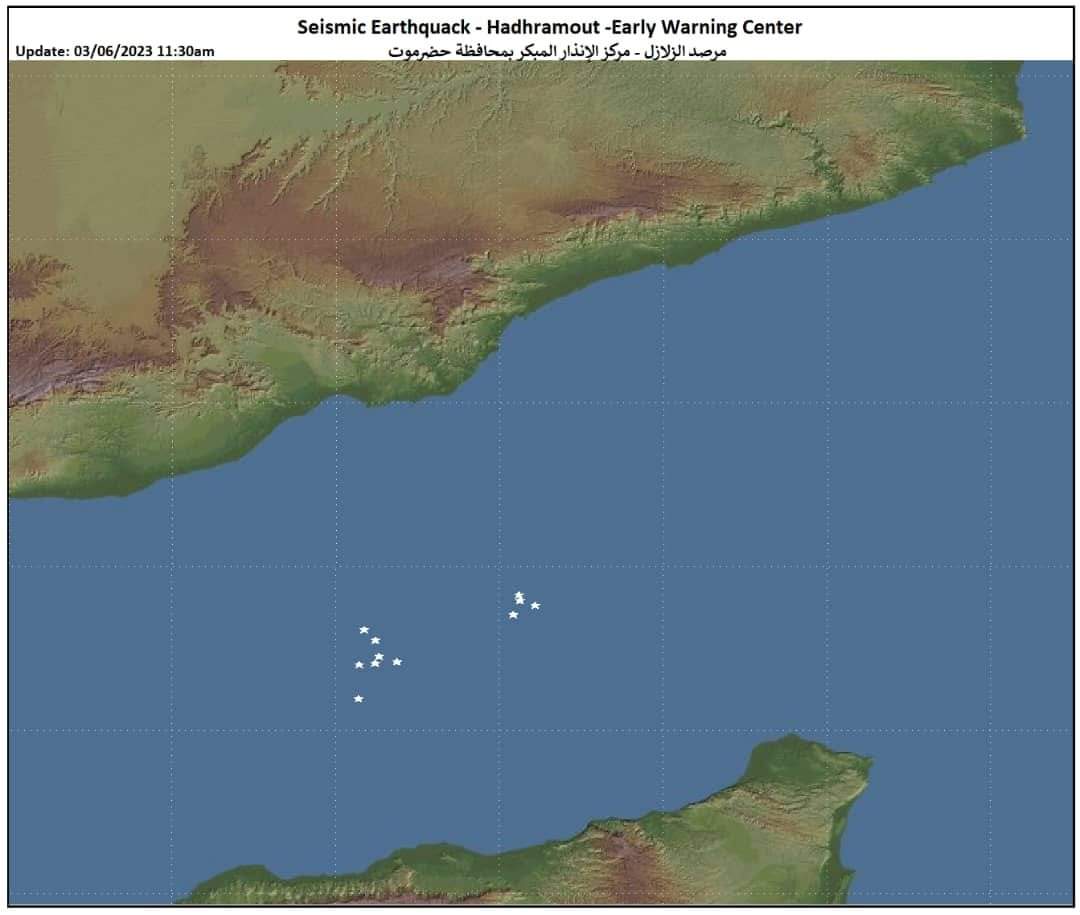 سجل مرصد الزلازل بمدينة المكلا المرتبط بشبكة محطات السيزميك العالمي منذ صباح اليوم السبت الموافق 2023/06/03م حوالي (20) هزة زلزالية بحرية حتى الساعة 8:00 من مساء اليوم ، تمركزت معظم بؤر الهزات الزلزالية البحرية في عمق خليج عدن المقابل لمحافظات حضرموت وشبوة وأبين ، تراوحت شدتها بين (4.4) إلى (6) درجات على مقياس ريختر ، تصنف معياريا كهزات بين المتوسطة إلى القوية .