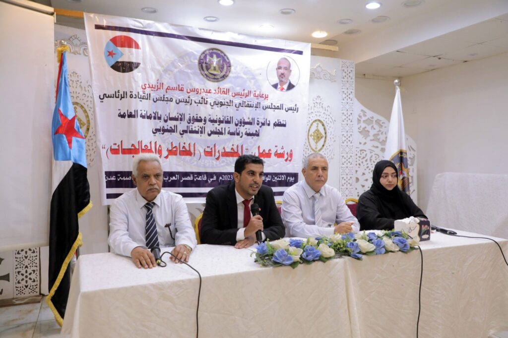 نظمت دائرة الشؤون القانونية وحقوق الإنسان في الأمانة العامة لهيئة رئاسة المجلس الانتقالي الجنوبي، اليوم الإثنين، ورشة عمل حملت عنوان ” المخدرات (المخاطر والمعالجات)”، برعاية الرئيس القائد عيدروس الزُبيدي رئيس المجلس الانتقالي الجنوبي، نائب رئيس مجلس القيادة الرئاسي.