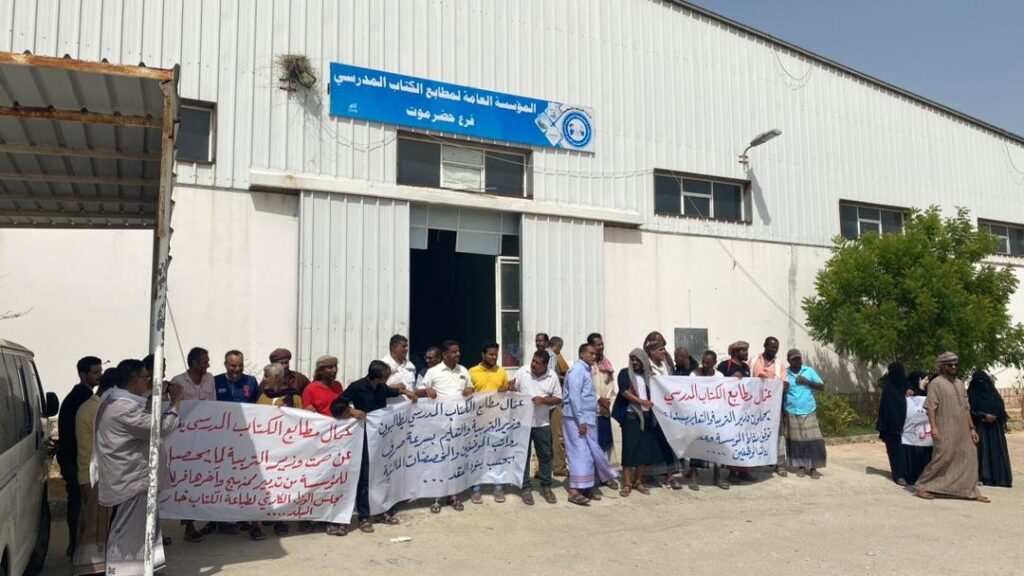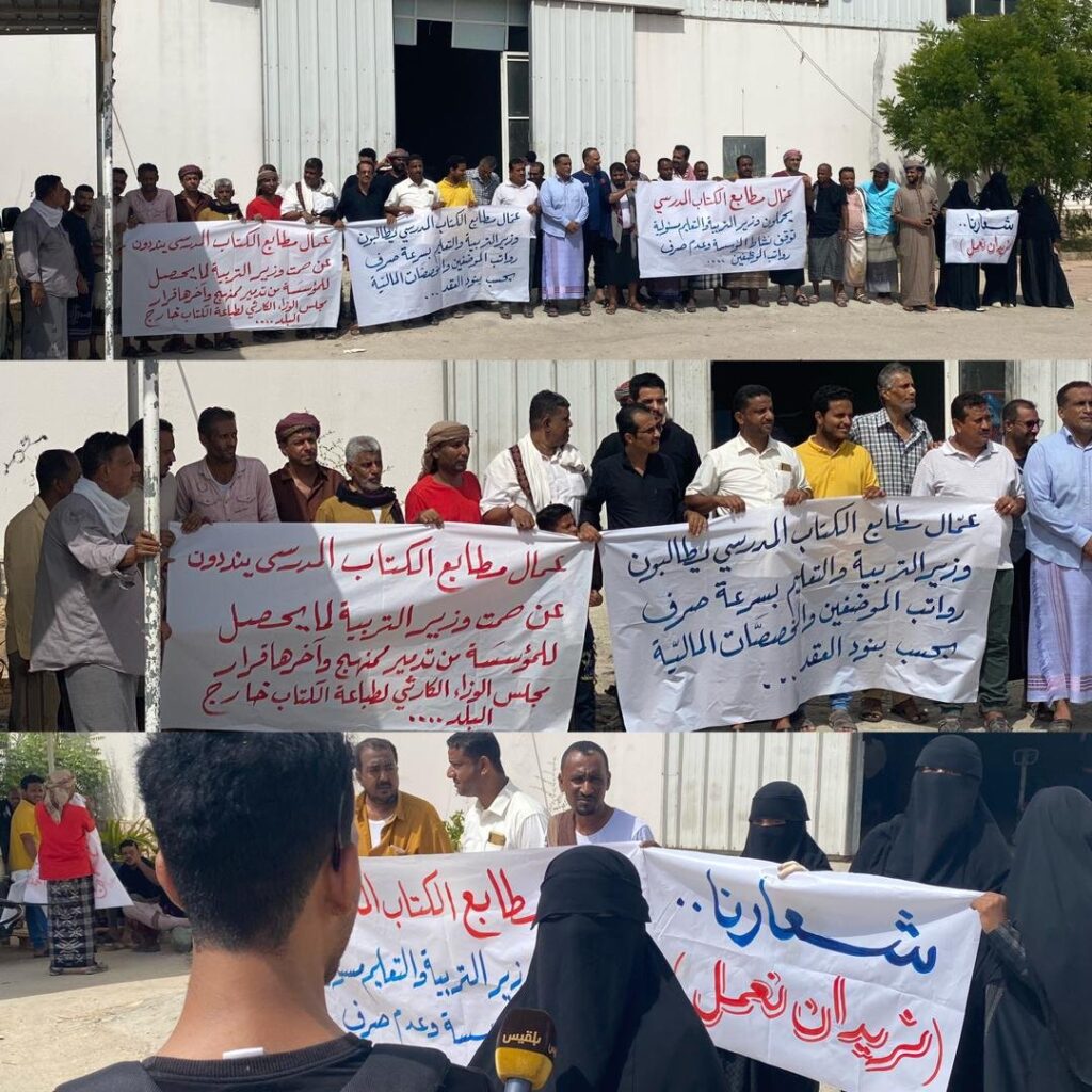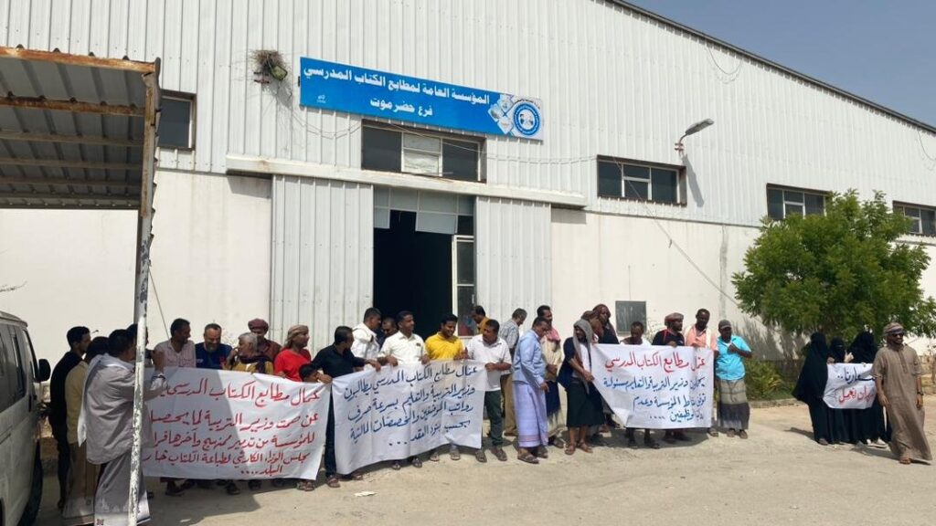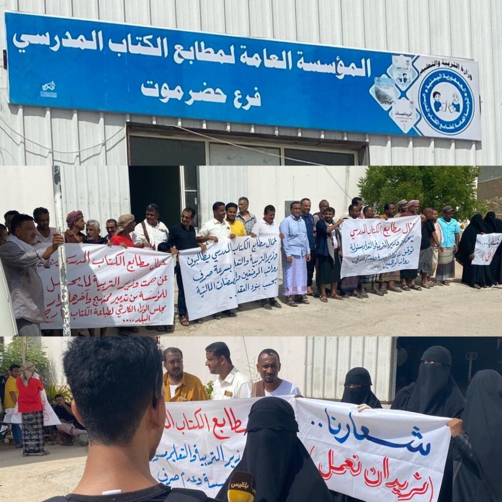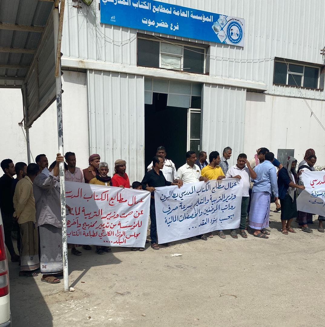 احتشد عمال وموظفي المؤسسة العامة لمطابع الكتاب المدرسي في حضرموت في وقفة احتجاجية منددين بإلغاء قرار مجلس الوزراء المجحف في حق العاملين في الصرح المؤسسي التعليمي الذي يرفد قطاع التعليم بالكتاب المدرسي وعبر المحتجين عن آسفهم لهذا القرار الذي ينص على طباعة الكتاب المدرسي بالخارج في ظل وجود مؤسسة متخصصة لديها امكانيات والقدرة على طباعة الكتاب المدرسي بأقل التكاليف وبجودة عالية انذاك الجهود التي يبذلها العاملين بالمطابع وانجاز الطباعة ، معبرين عن استيائهم الكبير من قبل وزير التربية والتعليم طارق العكبري لتخادله وسكوته عن هذا القرار بصفته رئيس مجلس إدارة المؤسسة العامة لمطابع الكتاب المدرسي وعدم رفضة لقرار مجلس الوزراء .