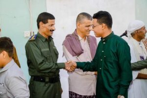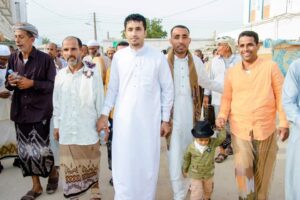 مع جموع المصلين من أبناء المنطقة. وقد تبادل المدير العام وبحضور القيادات العسكرية والأمنية ومدراء بعض الدوائر بديوان المديرية والأخ/ سعيد بن فضل رئيس حي النقعة التهاني القلبية مع المصلين. هذا وشارك العطيشي أبناء النقعة فعالية الزف الذي يقام بالنقعة عقب صلاة العيد حيث تحرك الموكب من ساحة المسجد الجامع وصولا الى بيت المنصب باوزير حسب العادة التي تجري على مدار تاريخ المنطقة وقد صاحب الزف والحضور الجماهيري الرقصة الشعبية التي قام بتأديتها الشباب. وعلى صعيد متصل قام المدير العام للمديرية ومرافقيه بحضور فعاليات العيد بمدينة الغيل عاصمة المديرية حيث اقيمت رقصة الزامل وسط فرحة من المواطنين الذين تبادلوا التهاني العيدية مع المدير العام. وضمن اهتمامات المدير العام للمديرية رئيس اللجنة الأمنية قام ومرافقيه بزيارات عيدية لبعض المواقع العسكرية حيث قدم التهاني لقيادة وافراد نقطة الصلب العسكرية مقدما لهم التهاني القلبية بمناسبة عيد الأضحى مؤكدا على قيامهم بواجباتهم الوطنية ومشيدا بجهودهم في خدمة المواطنين كرمز لقوات النخبة الحضرمية وأكد على دعم ومساندة السلطة المحلية لهم من خلال التنسيق المتواصل مع القيادات العسكرية المختصة.