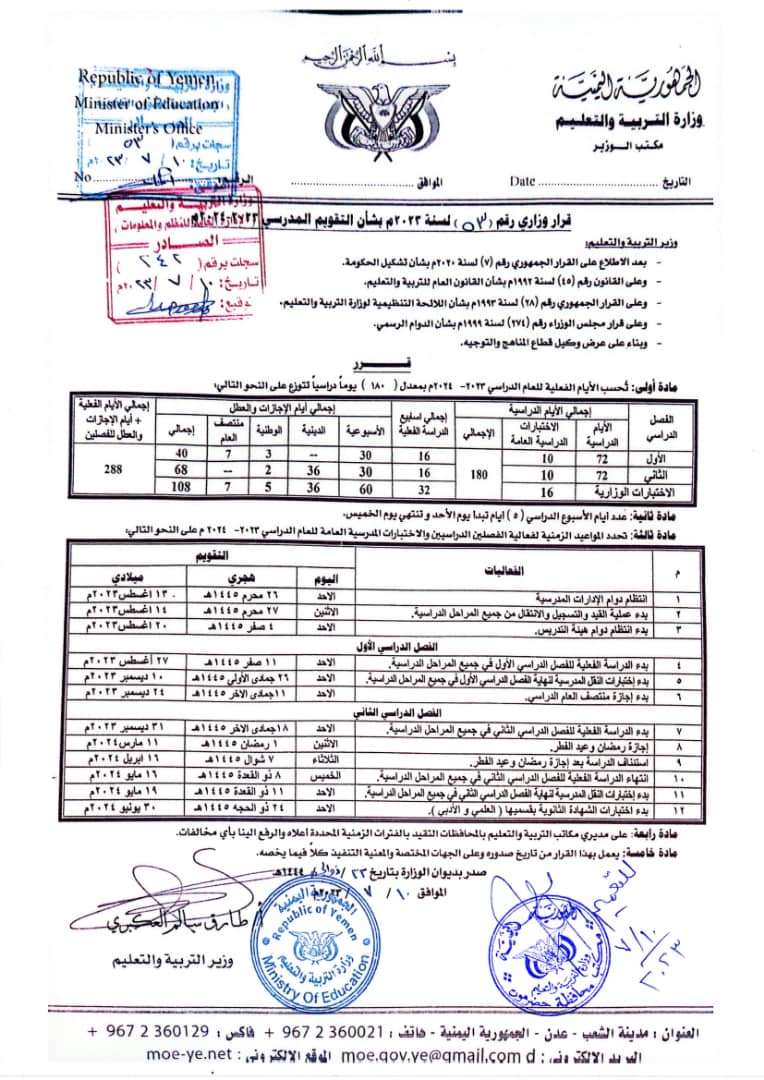 ووفقا للقرار الوزاري رقم لعام 2023 بشأن التقويم المدرسي للعام 2023/2024، بأن انتظام الإدارات المدرسية سيكون يوم الاحد 13 أغسطس المقبل على أن تبدأ عملية القيد والتسجيل والانتقال في جميع المراحل الدراسية يوم الاثنين الرابع عشر من الشهر ذاته، وأن انطلاق الدراسة الفعلية للفصل الدراسي الأول ستكون يوم الأحد 27 أغسطس.