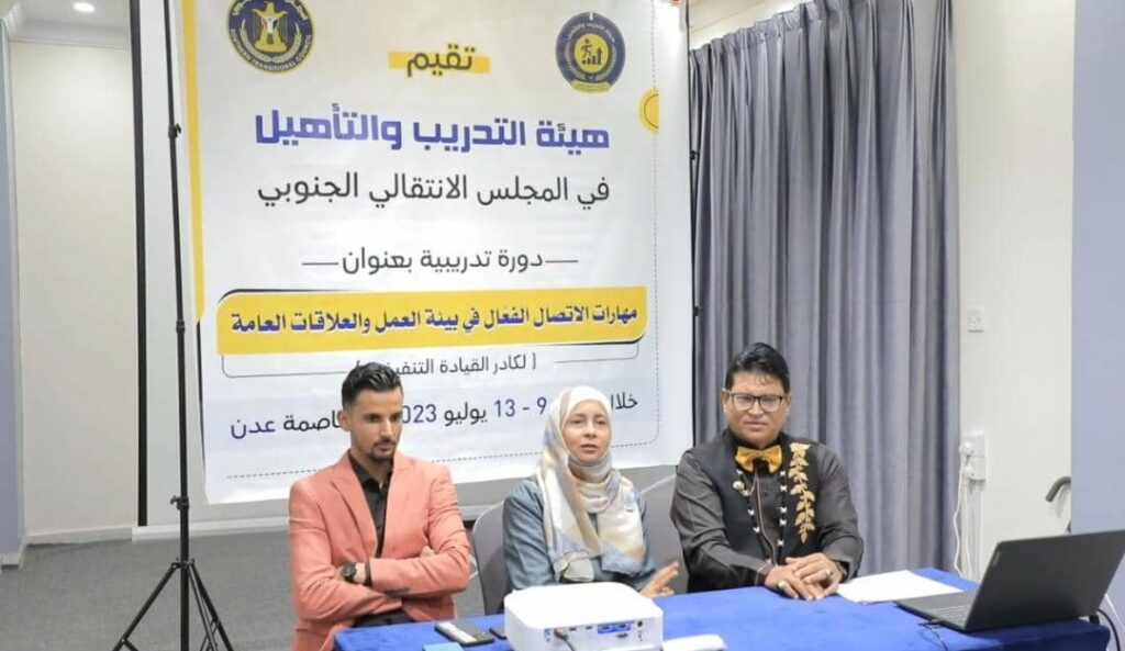 نظمت هيئة التدريب والتأهيل في المجلس الانتقالي الجنوبي، اليوم الاحد، في العاصمة عدن، دورة تدريبية حول مهارات الاتصال الفعّال في بيئة العمل والعلاقات العامة لكوادر القيادة المحلية للمجلس في العاصمة عدن.
