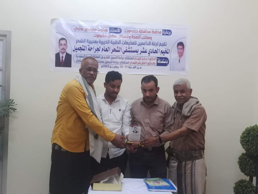 برعاية كريمة من محافظ محافظة حضرموت الأستاذ مبخوت بن ماضي ومدير مكتب الصحة والسكان بساحل حضرموت الدكتور محمد صالح الجمحي اختمم المخيم الطبي الحادي عشر بمستشفى الشحر العام أعماله بإجراء 32 عملية في جراحة التجميل بعضها نوعية .
