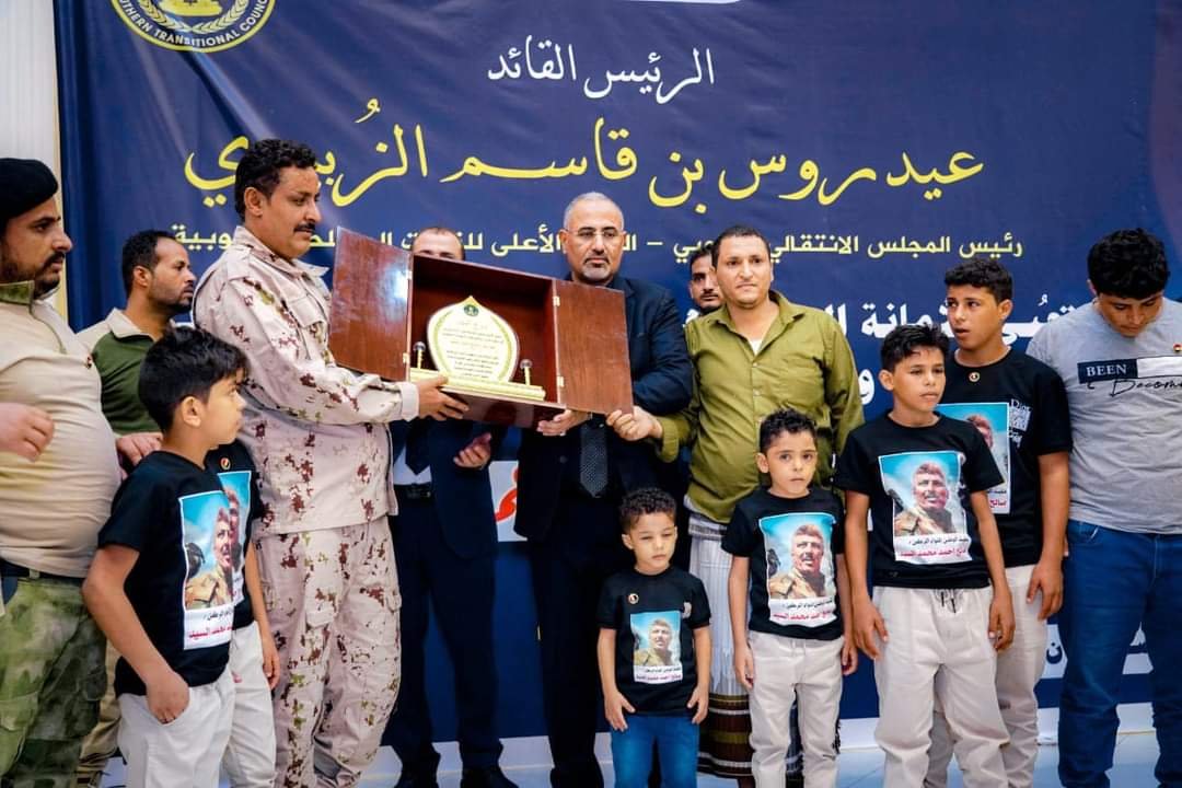 وسلّم الرئيس القائد بعدها درعا تذكاريا لأسرة وذوي الفقيد عرفانا وتقديرا بالسيرة النضالية الطويلة للفقيد وأدواره الوطنية، وما قدمه من إسهامات مشهودة في وضع الأساسات المتينة للقوات المسلحة الجنوبية، وتضحيات جسيمة في مواجهة خطر المليشيات الحوثية والتنظيمات الأرهابية.