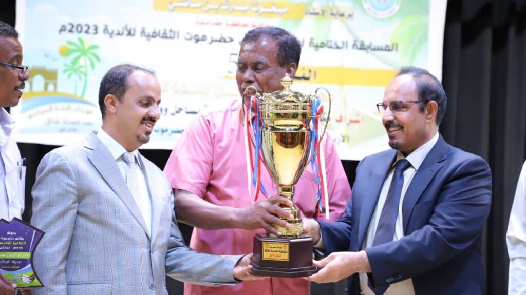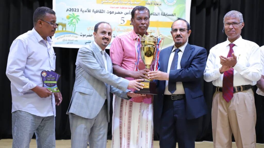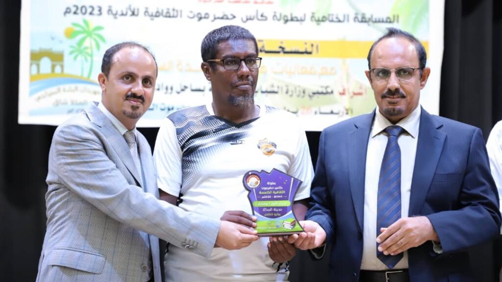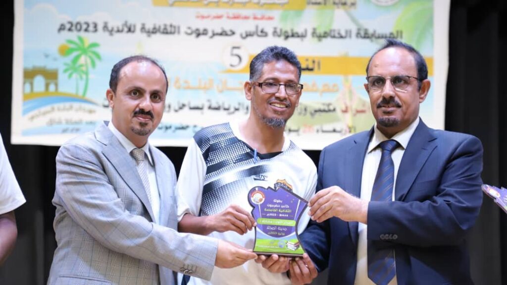 وشهد الحفل الختامي للبطولة التي شارك فيها 16 ناديًا واقيمت برعاية محافظ حضرموت واشراف مكتبي وزارة الشباب والرياضة بساحل ووادي حضرموت، ونظمتها اللجنة الرئيسة لكأس حضرموت الثقافية، بالتزامن مع مهرجان البلدة السياحي 2023م، تقديم مسرحية معبرة وفيديو وصفي للمكلا ، واستضافة رياضية فنية مزدوجة مع الكابتن اللاعب السابق والشاعر الغنائي الكبير عبدالله محمد مقادح بمعية الفنان عازف العود احمد مرجان.