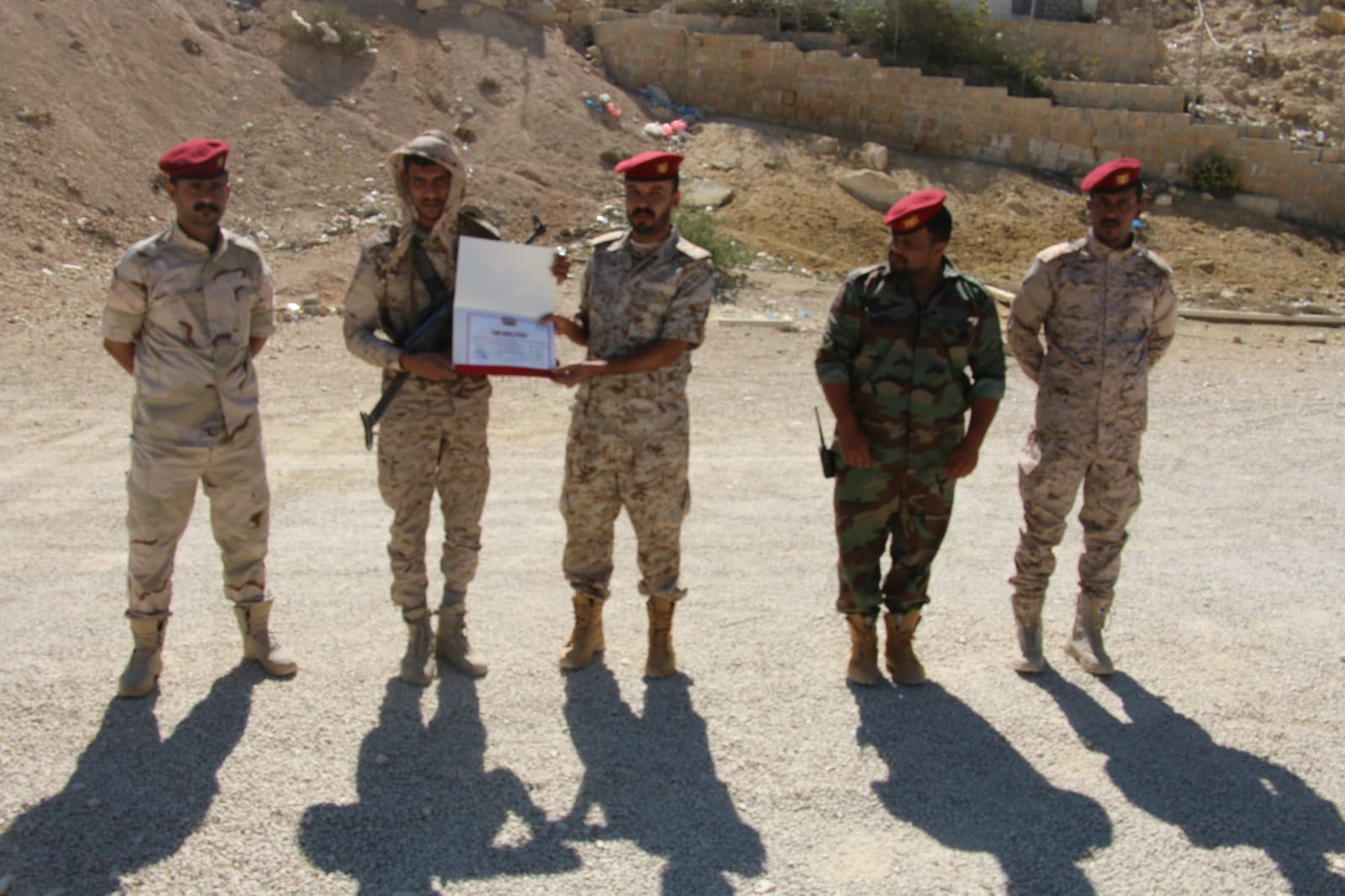 وفي ختام الدورة تم تكريم المبدعين والبارزين من الأفراد المشاركين في البرنامج التدريبي بحضور قائد المعسكر المقدم بدر محمد الحامدي و مسؤول التدريب الملازم أول عمر علي السومحي وفريق التوجيه المعنوي بالقيادة والسيطرة، وعدد من ضباط وصف ضباط المعسكر.
