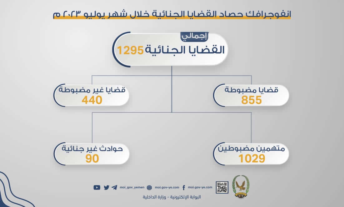 وأوضحت التقارير الصادرة عن الأجهزة الأمنية لشهر يوليو ضبطها 855 جريمة جنائية كشف عن أسبابها وملابساتها الحقيقية، وضبط مرتكبيها، فيما لا زالت إجراءات البحث والتحري حول بقية الجرائم مستمرة لكشف ملابساتها ومرتكبيها لضبطهم وتقديمهم للعدالة.