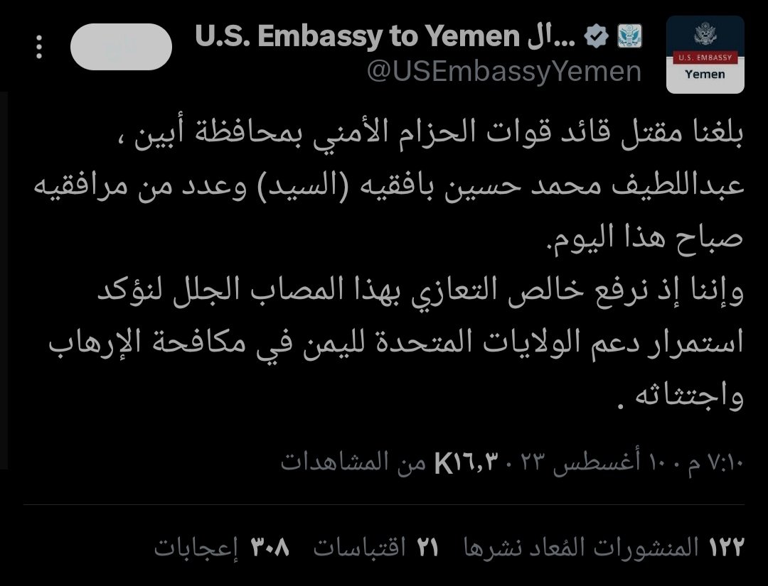نعت سفارة الولايات المتحدة الشهيد عبداللطيف محمد حسين بافقيه (السيد)، قائد قوات الحزام الأمني بمحافظة أبين، وعدد من مرافقيه.