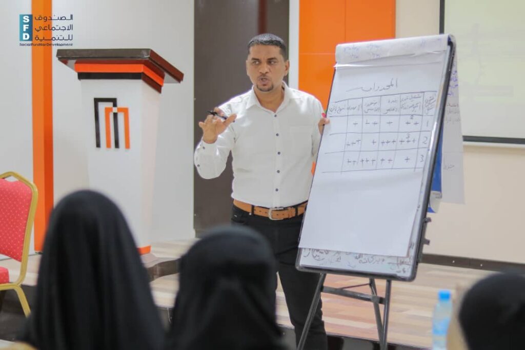 وتمحور البرنامج التدريبي حول الاهتمام بشرح تفصيلي لجميع الأدوات البحثية التي يحتاجها كل استشاري أثناء عمله الميداني،وماتعكسه الأدوات من بيانات دقيقة لدى مسؤولي برنامج النقد مقابل العمل (الأشغال كثيفة العمالة) يستطيعوا من خلالها معرفة المجتمعات الأكثر احتياجا ضمن استهدافاتهم المستقبلية في مختلف المديريات والقرى التي تندرج ضمن نطاق الصندوق الاجتماعي للتنمية فرع المكلا.