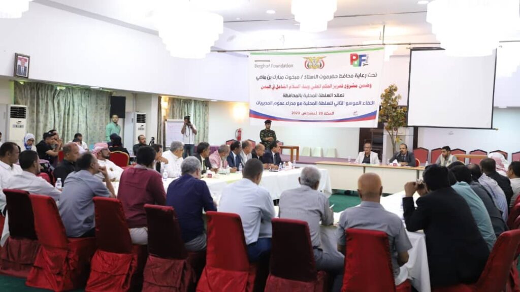 عُقد اليوم بالمكلا اللقاء الموسع لقيادة السلطة المحلية بمحافظة حضرموت مع المديرين العامين لمديريات المحافظة، ضمن مشروع تعزيز الحكم المحلي وبناء السلام الشامل في اليمن.