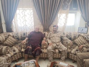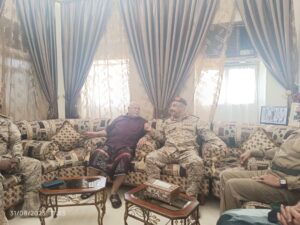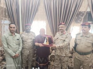 سلّم قائد المنطقة العسكرية الثانية، اللواء الركن طيّار فائز منصور التميمي، اللواء الركن عبدالرحيم أحمد عتيق، قائد المنطقةالعسكريةالثانية الأسبق؛ درع الوفاء من المنطقة العسكرية الثانية، خلال زيارته بيت اللواء “عتيق” بمدينة سيئون، صباح اليوم.