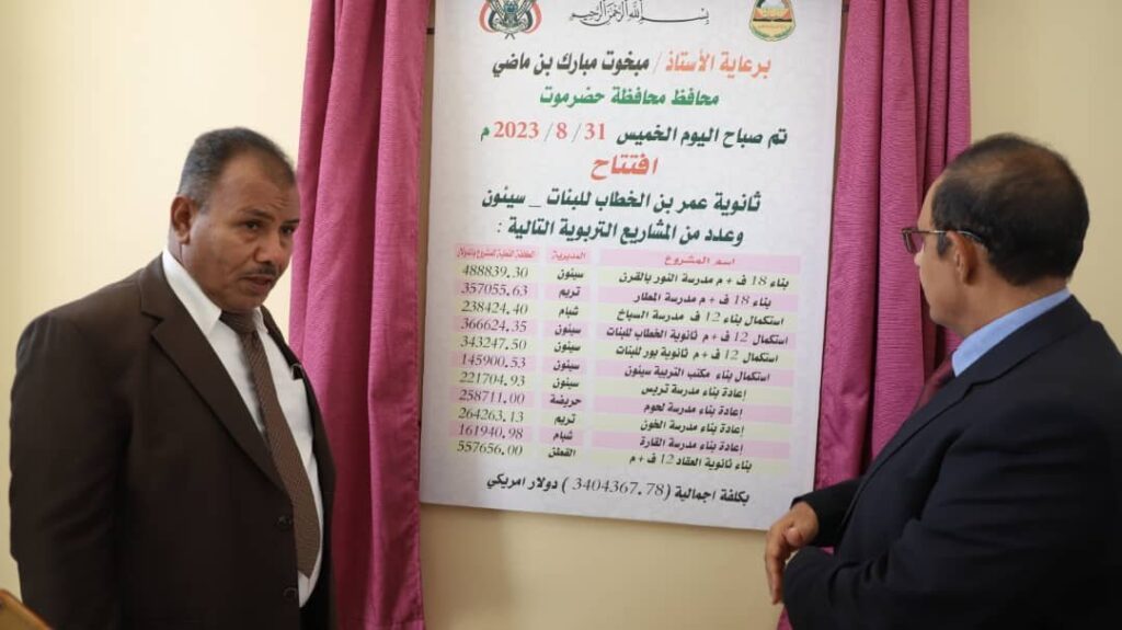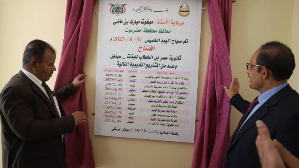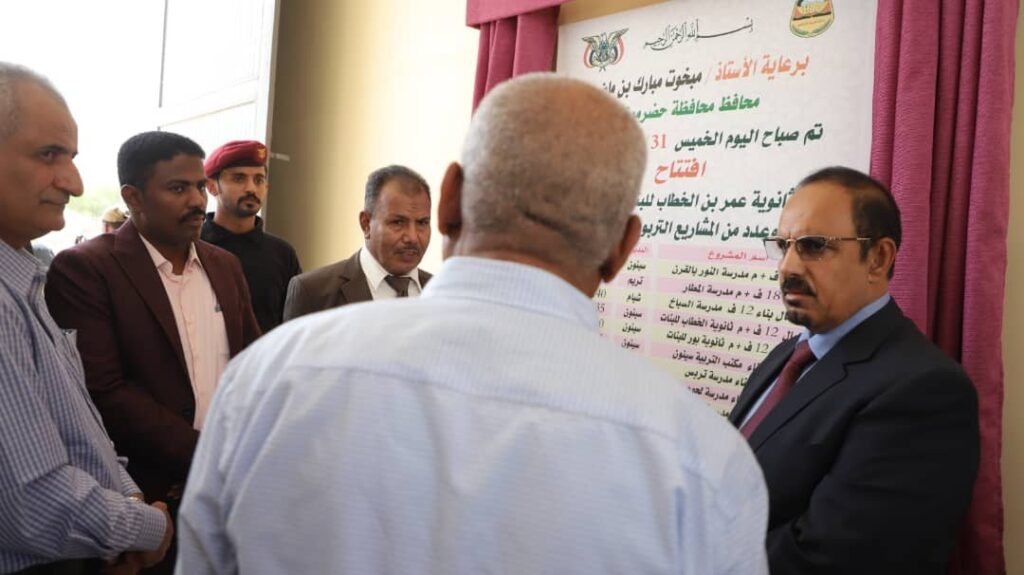 وافتتح محافظ حضرموت بناء 18 فصلاً دراسيًا بمدرسة النور بالقرن مديرية سيئون، ومشروع بناء 18 فصلاً دراسيًا بمدرسة المطار بمديرية تريم، واستكمال بناء 12 فصلاً دراسيًا بمدرسة السباخ بشبام، واستكمال 12 فصلاً دراسيًا بثانوية الخطاب للبنات بسيئون، ومشروع استكمال انشاء 12 فصلاً دراسيًا بثانوية بـُور للبنات بسيئون، واستكمال بناء مكتب التربية والتعليم بمديرية ب