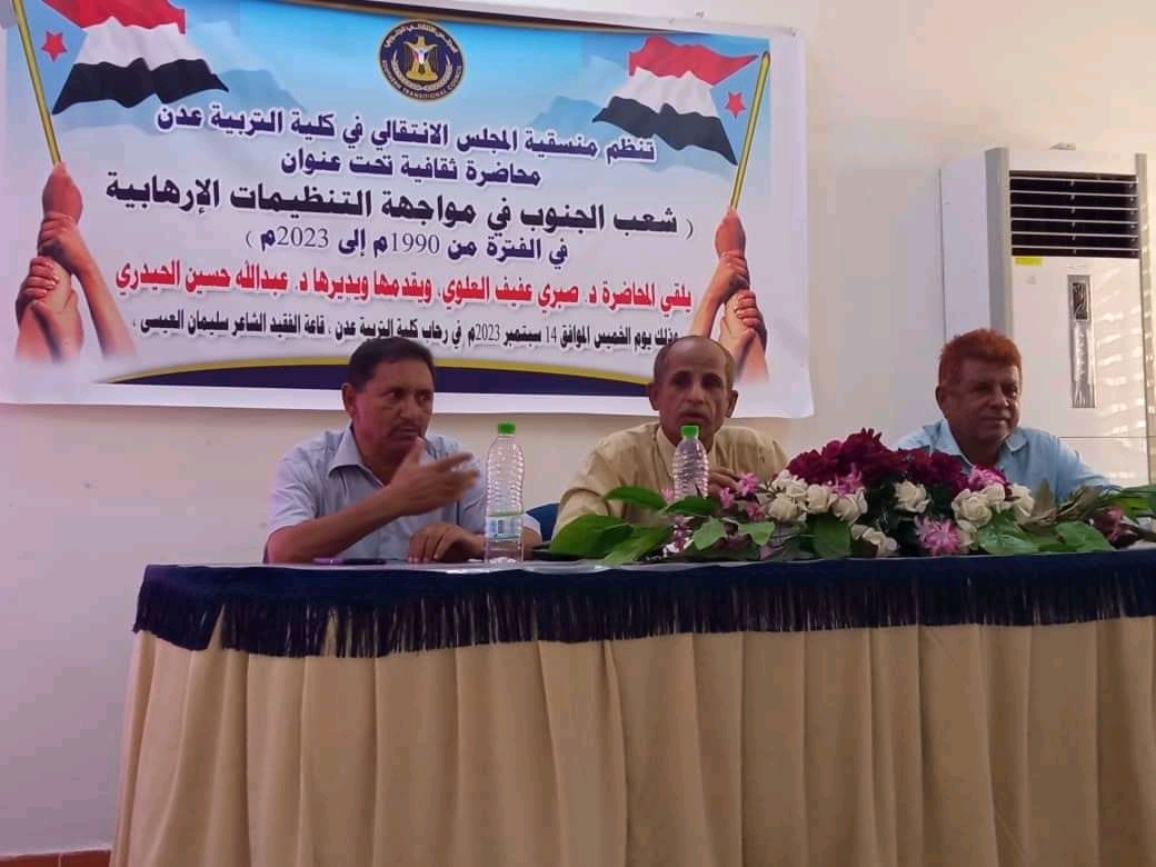 نظمت منسقية المجلس الانتقالي الجنوبي بكلية التربية بجامعة عدن محاضرة توعوية بعنوان “شعب الجنوب في مواجهة التنظيمات الإرهابية”.