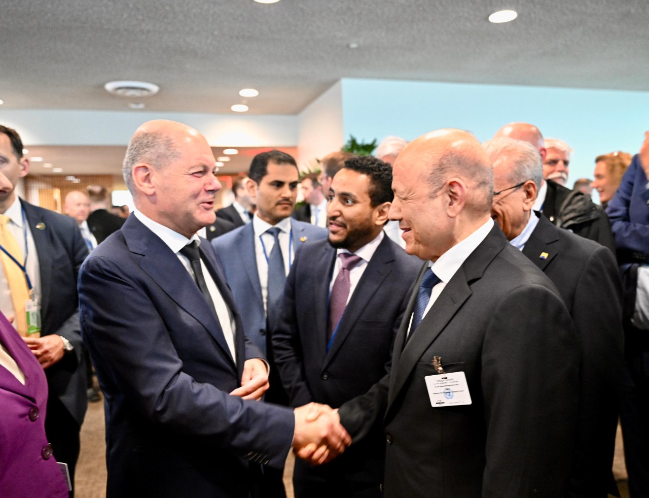 وخلال الفعالية التي اقيمت بالتزامن مع اجتماعات الدورة الثامنة والسبعين للجمعية العامة للامم المتحدة التي تنطلق اعمالها اليوم الثلاثاء، اعرب رئيس مجلس القيادة الرئاسي باسمه واعضاء المجلس والحكومة للمستشار اولاف شولتس عن خالص تهانيه لجمهورية المانيا، وشعبها الصديق بمناسبة مرور 50 عام على عضويتها في الامم المتحدة.